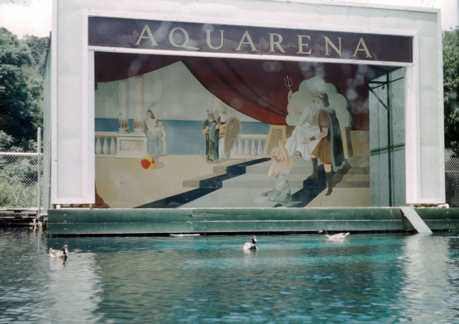 King Triton was featured on a backdrop for the Aquarena stage in 1959, with some lovely maids and perhaps members of his court. |
