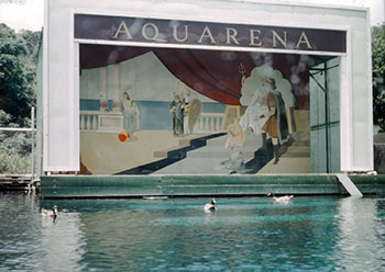 In 1926 A. B. Rogers purchased Burleson's homestead tract, including the two-room cabin, for $21,466 (Hays County Deed Records 91:458) and by 1929 he had built a 200' long hotel that was first named the Spring Lake Park Hotel and was later known as the Landmark Inn. In 1949 Paul Rogers bought the land from his parents and founded Aquarena Springs, which became a popular tourist attraction and resort. The name derived from a concatenation of 'Aqua', referring of course to water, and 'arena', referring to a submersible underwater theatre that was considered an engineering marvel in the 1952 edition of Popular Mechanics. Ralph the Swimming Pig and frolicking underwater mermaid dancers became trademarks. Glass-bottomed boat tours offered a look at the flooded Springs - smaller ones appear as bubbling sands and are easily visible on the lake bottom.