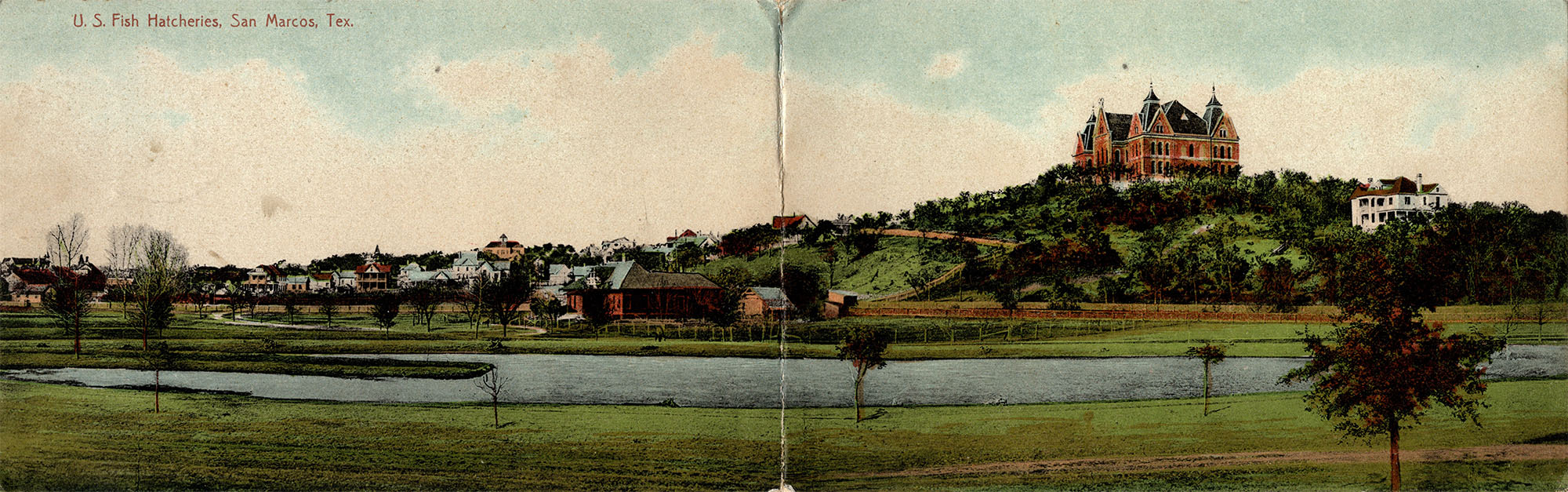 An undated postcard showing an aerial view of the Teachers College and Fish Hatchery. Published by Smith News Agency of San Marcos. |